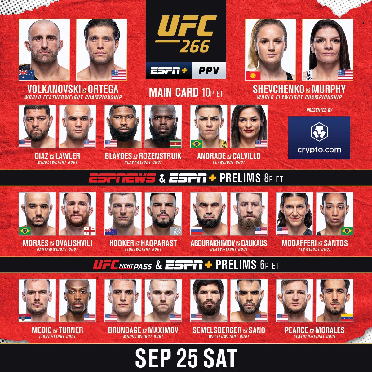 UFC 266 undercard preview. Two Titles Are On The Line In A Banger Of A Card On International Fight Week. Prelims Get Underway Saturday At 6pm3pm ETPT.